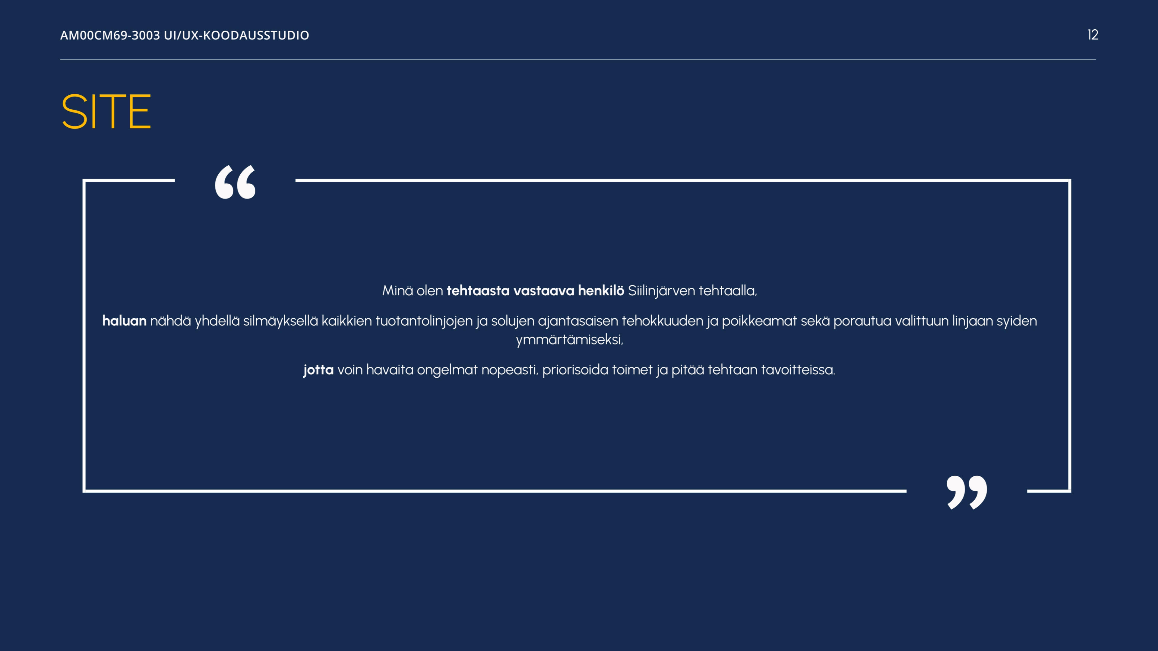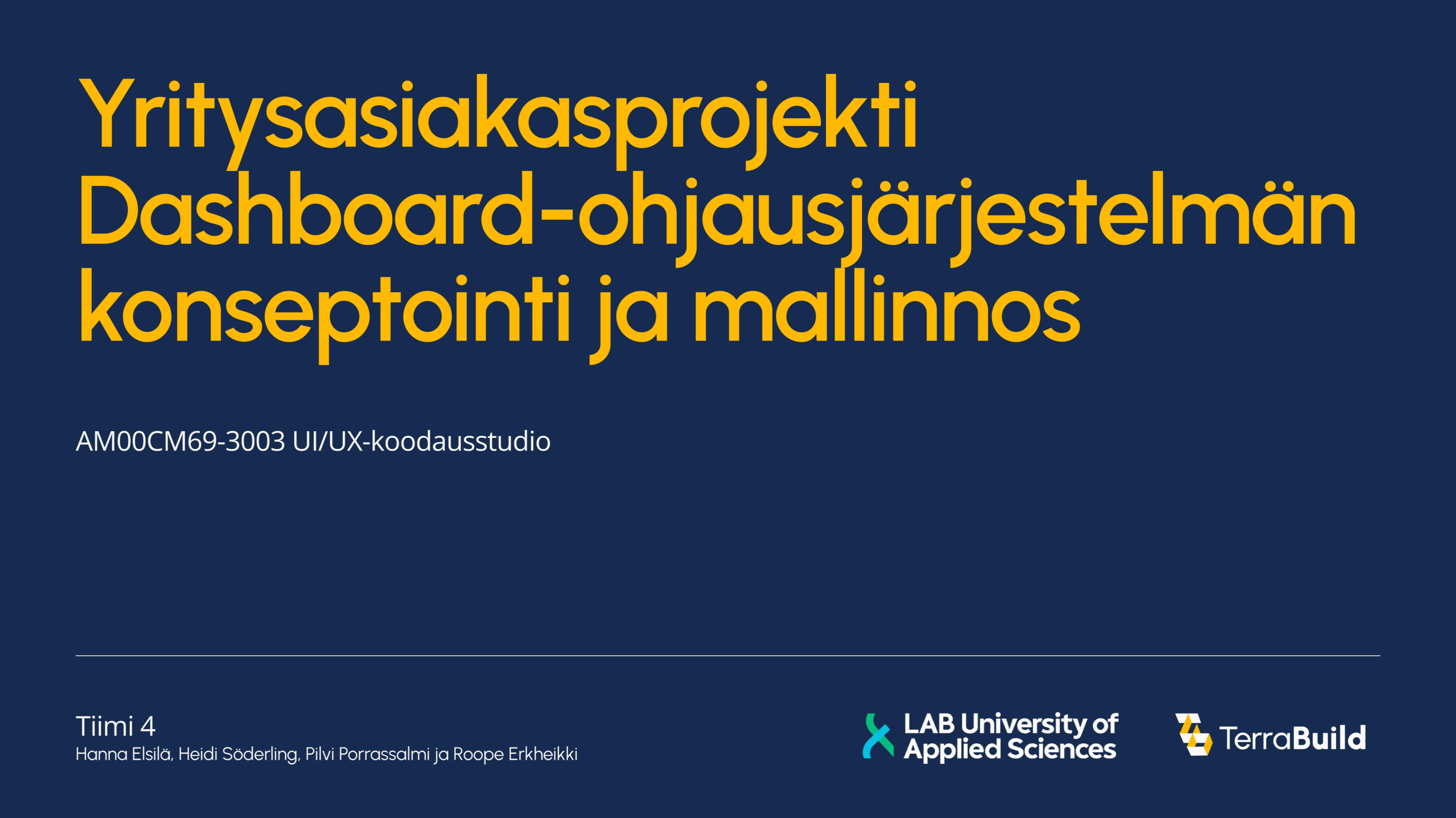 Syksyllä 2025 toteutetulla UI/UX-koodausstudio -kurssilla (1.9.2025–17.12.2025) osallistuin laajaan yritysasiakasprojektiin, jonka toimeksiantajana toimi IT-konsultointiyritys Forge Digital Oy. Projektin tavoitteena oli konseptoida ja mallintaa Dashboard-ohjausjärjestelmä kuvitteelliselle TerraBuild-asiakasyritykselle, joka valmistaa pienkuormaajia ja -kaivureita. Haasteena oli valtavan datamäärän (IoT, robotit, ERP) muuntaminen ymmärrettäväksi ja visuaalisesti selkeäksi päätöksenteon tueksi.Projekti toteutettiin neljän hengen tiiminä. Vastasin kokonaisuudessa SITE-näkymän suunnittelusta, joka tarjoaa tehdaspäällikölle reaaliaikaisen näkymän yksittäisen tehtaan (Siilinjärvi) tuotantolinjojen tehokkuuteen ja poikkeamiin. Tämän lisäksi vastasin projektin Design Systemin rakentamisesta ja ylläpidosta. Huolehdin erityisesti siitä, että järjestelmä hyödynsi Figman muuttujia (variables) ja tokeneita tavalla, joka vastasi asiakkaan toiveita joustavuudesta ja brändinmukaisuudesta.