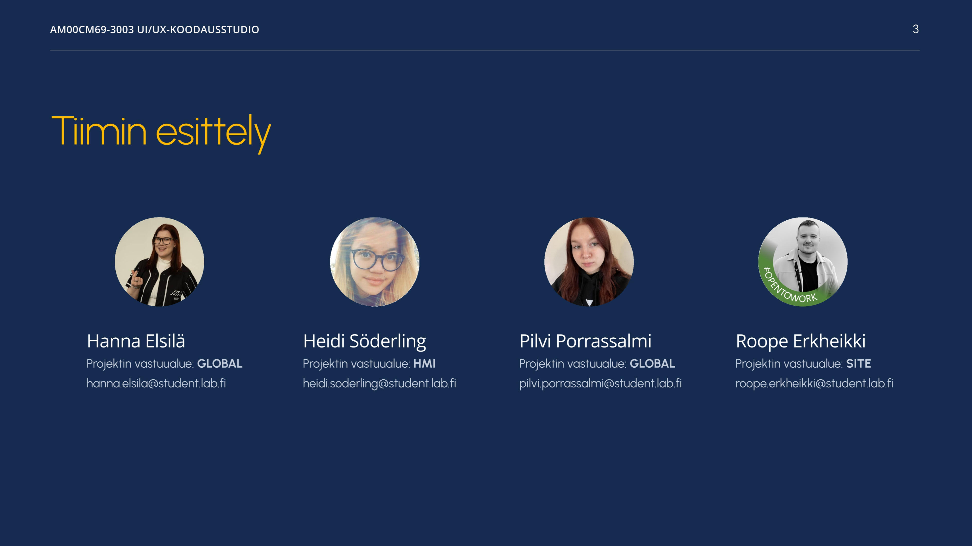 Vaikka vastasimme tiimissä omista osa-alueistamme (Global, Site, HMI), onnistuimme luomaan yhtenäisen kokonaisuuden, joka näyttää yhdeltä kädenjäljeltä. Tiimimme kannustava ilmapiiri mahdollisti rakentavan palautteen ja tehokkaan ongelmanratkaisun.