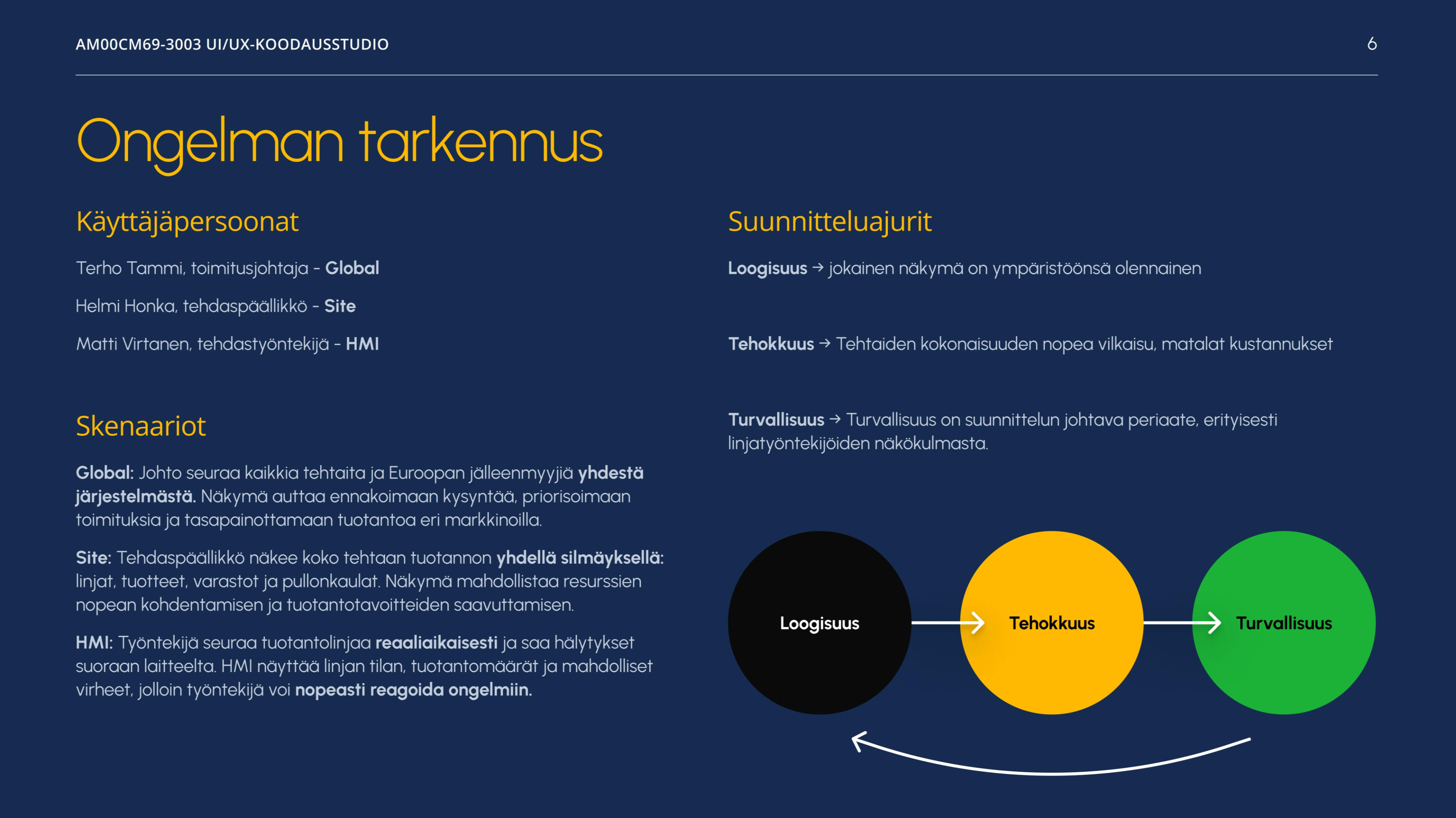 Syvensin ymmärrystäni teollisen käyttöliittymän vaatimuksista ja opin, että visuaalinen näyttävyys on aina toissijaista tiedon luettavuudelle ja yksiselitteisyydelle. Huomiovärien säästeliäs ja semanttinen käyttö osoittautui kriittiseksi tekijäksi käyttäjän kognitiivisen kuorman minimoimisessa.Ketterä reagointi palautteeseen: