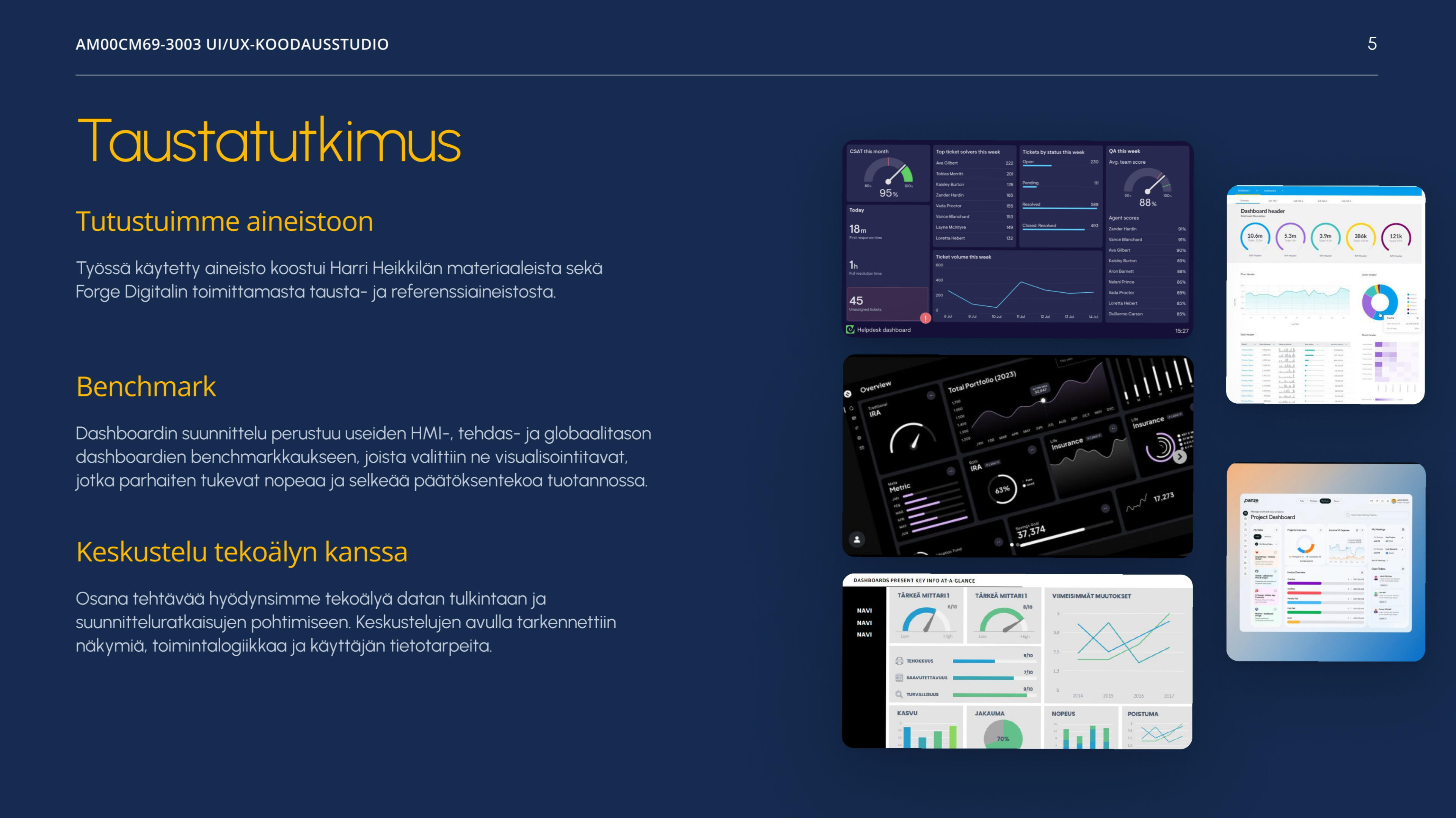 Syksyllä 2025 toteutetulla UI/UX-koodausstudio -kurssilla (1.9.2025–17.12.2025) osallistuin laajaan yritysasiakasprojektiin, jonka toimeksiantajana toimi IT-konsultointiyritys Forge Digital Oy. Projektin tavoitteena oli konseptoida ja mallintaa Dashboard-ohjausjärjestelmä kuvitteelliselle TerraBuild-asiakasyritykselle, joka valmistaa pienkuormaajia ja -kaivureita. Haasteena oli valtavan datamäärän (IoT, robotit, ERP) muuntaminen ymmärrettäväksi ja visuaalisesti selkeäksi päätöksenteon tueksi.Projekti toteutettiin neljän hengen tiiminä. Vastasin kokonaisuudessa SITE-näkymän suunnittelusta, joka tarjoaa tehdaspäällikölle reaaliaikaisen näkymän yksittäisen tehtaan (Siilinjärvi) tuotantolinjojen tehokkuuteen ja poikkeamiin. Tämän lisäksi vastasin projektin Design Systemin rakentamisesta ja ylläpidosta. Huolehdin erityisesti siitä, että järjestelmä hyödynsi Figman muuttujia (variables) ja tokeneita tavalla, joka vastasi asiakkaan toiveita joustavuudesta ja brändinmukaisuudesta.