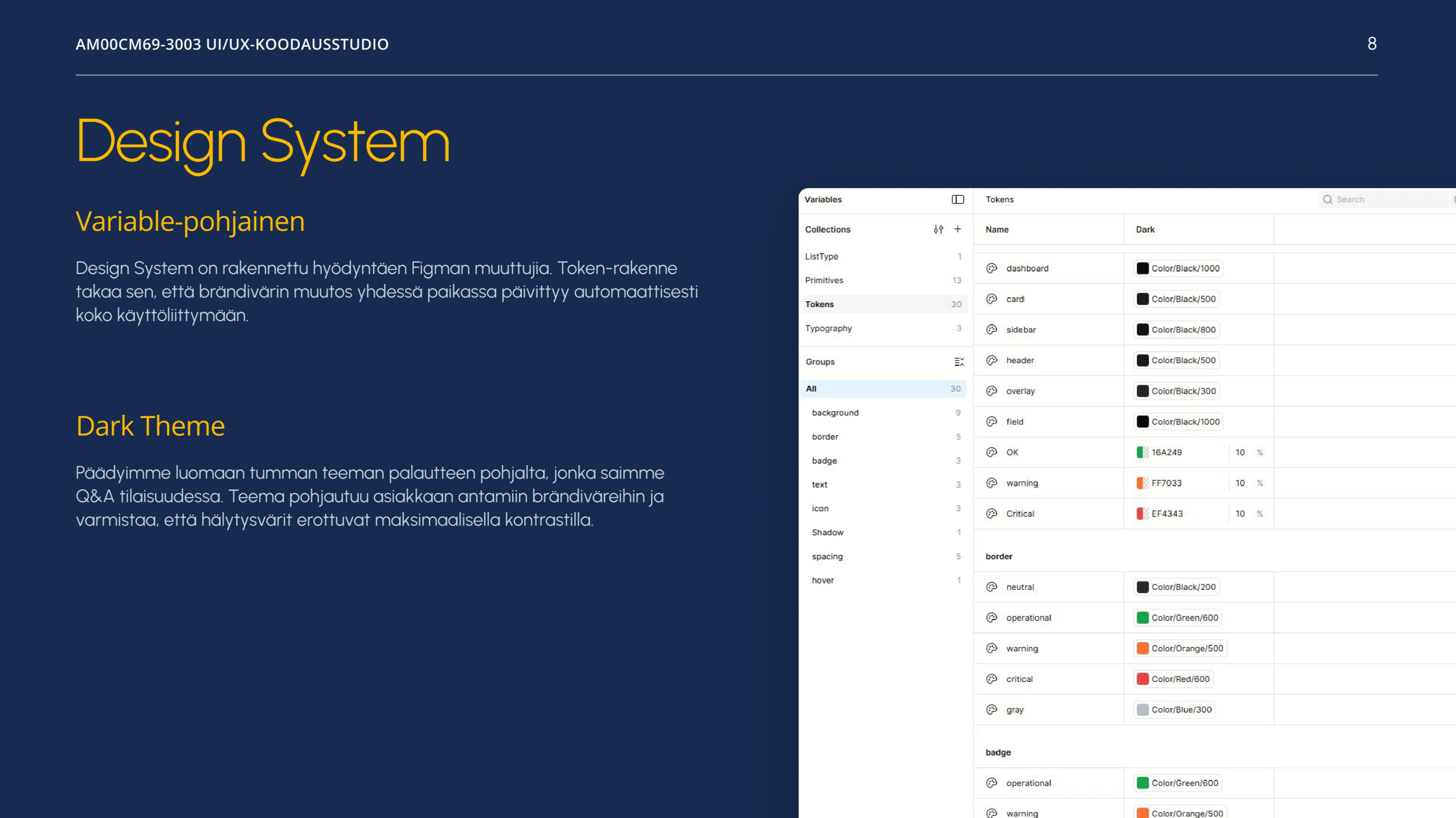 Koodissa toimiviksi todetut ratkaisut ja logiikat dokumentoitiin ja siirrettiin takaisin Figman komponenteiksi ja Design Systemin muuttujiksi.